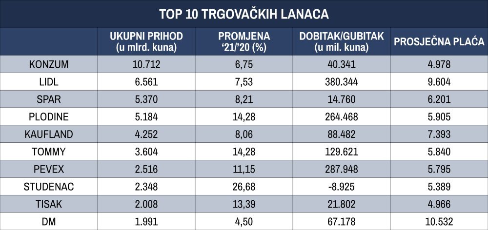 Vodeća mjesta na top listi najvećih drže Konzum, Lidl i Spar, a u top pet još se nalaze Plodine i Kaufland.
