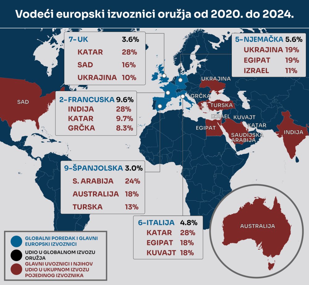 Oružje proizvedeno u Europi odlazi u tri pravca. Prvo – u samu Europu. Ukrajina je, braneći se od ruske invazije, postala najveći svjetski uvoznik oružja u razdoblju 2020.–2024. godine, s udjelom od 8,8 posto globalnog uvoza. Europske članice NATO-a također su ubrzale obnovu svojih arsenala. Posebno je znakovito to da je SAD isporučio 64 posto uvezenog oružja europskim članicama NATO-a, u odnosu na 52 posto u prethodnom petogodišnjem razdoblju.