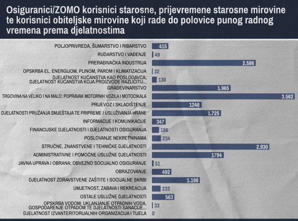 Najviše umirovljenika na pola radnog vremena, njih 3.652, radi u trgovačkim djelatnostima. Slijede stručne, znanstvene i tehničke djelatnosti s gotovo tri tisuće umirovljenika, a na trećem mjestu je prerađivačka industrija s 2.586 korisnika mirovine.