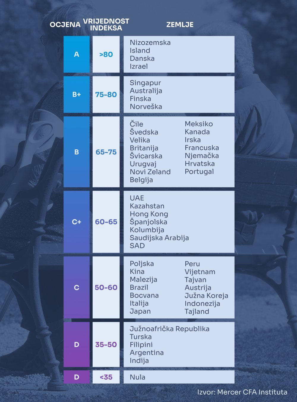 Iako smo često svjedoci kritika hrvatskog mirovinskog sustava, najnovije globalno istraživanje Mercera i CFA Instituta pokazuje ponešto drugačiju sliku. Hrvatska je u ovoj opsežnoj analizi u svim segmentima bila iznad prosjeka u komparaciji s 48 mirovinskih sustava koji pokrivaju 65 posto svjetskog stanovništva