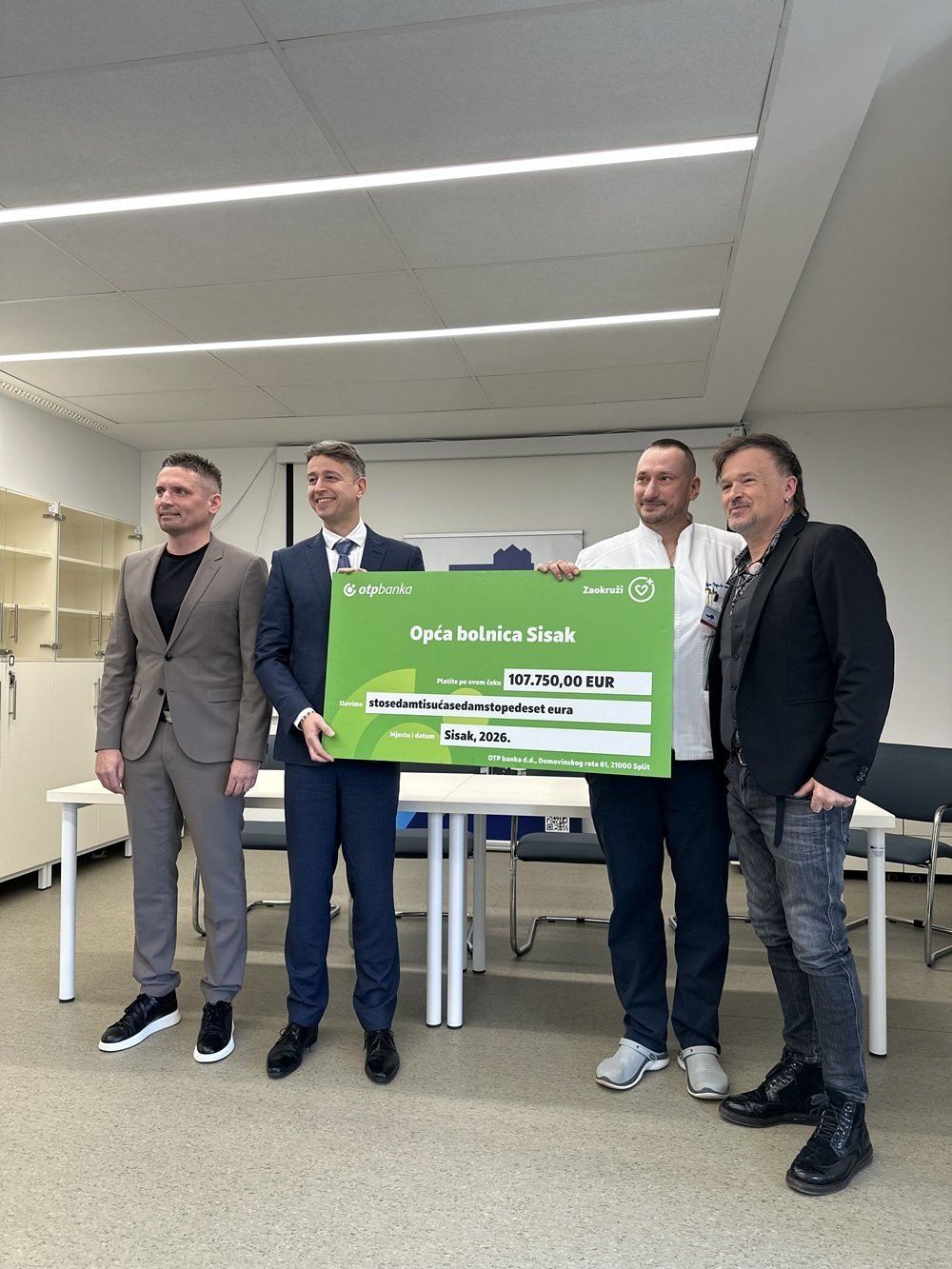 Donacijski ček ravnatelju Opće bolnice 'Dr. Ivo Pedišić' Sisak Igoru Vrgi uručio je predsjednik Uprave OTP banke, Balázs Békeffy, uz potporu ambasadora projekta, Zlatana Stipišića Gibonnija. Uručenju donacije su nazočili i državna tajnica u Ministarstvu zdravstva Marija Bubaš, gradonačelnik Siska Domagoj Orlić te pročelnica Upravnog odjela za zdravstvo, socijalnu skrb i hrvatske branitelje Sisačko-moslavačke županije Marija Valešić.