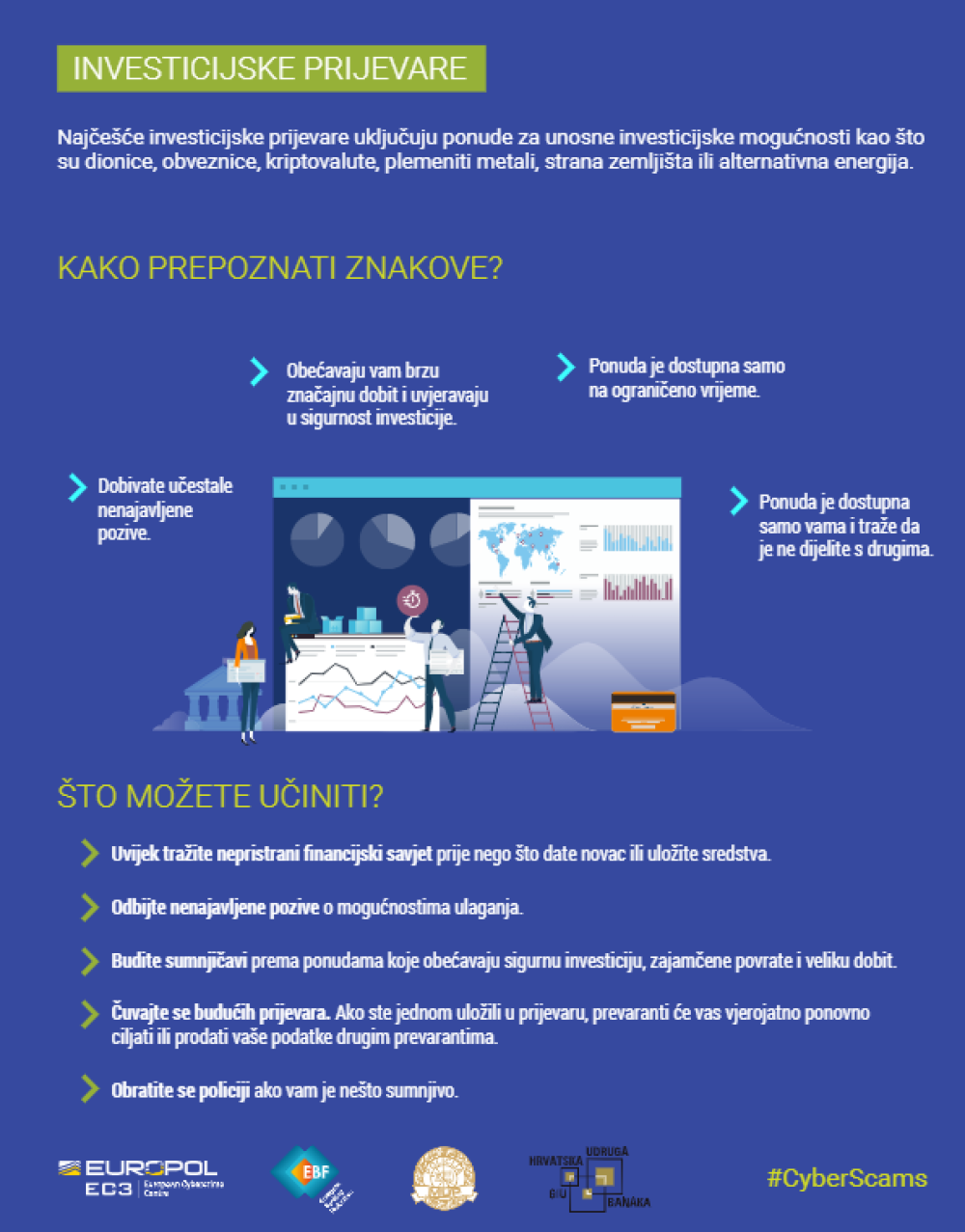 Stoga, dobro pripazite s kime stupate u poslovne kontakte, ne nasjedajte na ovakve i slične oglase, odnosno ponude o „povoljnim“ poslovnim investicijama, ne upuštajte se u sumnjive novčane transakcije kako ne bi postali žrtve prevaranata. Prilikom razmatranja bilo kakvih ponuda o povoljnom investiranju i ulaganju novčanih sredstava, budite vrlo oprezni i sumnjičavi, dobro se informirajte te potražite profesionalne i stručne financijske savjetnike.