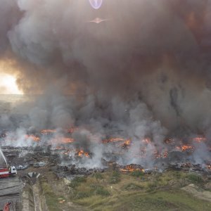 Veliki požar koji je u noći na srijedu buknuo u skladištu plastike osječke tvrtke Drava International gori tijekom cijelog dana, a dimom nošene čestice izgorene plastike došle su i do granice s BiH. Tijekom pokušaja obuzdavanja vatrene stihije, ozlijeđena su tri vatrogasca. Fotoreporter agencije Pixsell Davor Javorović zabilježio je zastrašajuću stihiju.