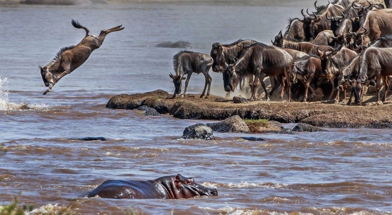 Fotografkinja Shayne McGuire iz San Dimasa u Kaliforniji ulovila je gnua na čelu krda kako skače na glavu u rijeku.
