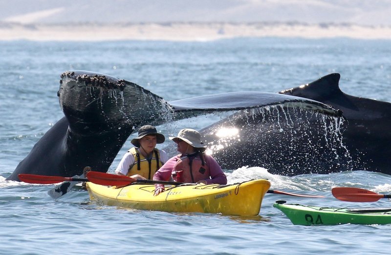 Turisti koji su išli malo veslati u zaljevu Monterey u Kaliforniji u potpunosti su propustili primijetiti kako im iza leđa izranjaju i zaranjaju kitovi. Ogromni grbavi kitovi za tren su nestali natrag pod površinom oceana, a majka i sin na fotografiji nastavili su bezbrižno svoj izlet u kajaku.