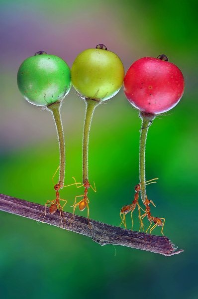 Mravi koji nose bobice izgledaju kao da nose balone. Mravi na fotografiji nose indonezijsko voće poznato kao Buah Seri. Fotografiju je slikao Eko Adiyanto u vrtu svog doma na zapadu Jave.