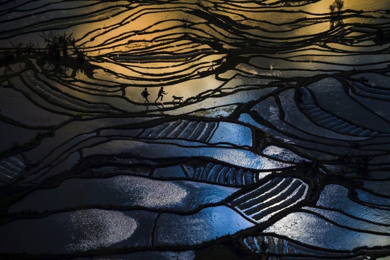 Polja riže u kineskoj provinciji Yunnan. Na fotografiji su ljudi sa psom, a cijela scena je slikana sa udaljenosti od oko 200 metara.