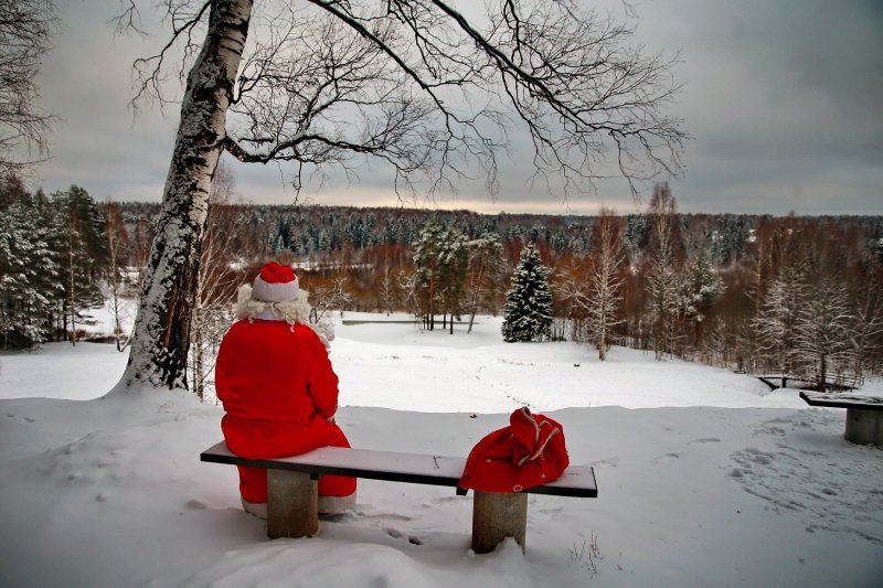 Ruskog Djeda Mraza fotografirao je Vladimir Smirnov u Kostromi. Djed Mraz sjedi na klupi, a pokraj njega je vreća s poklonima.