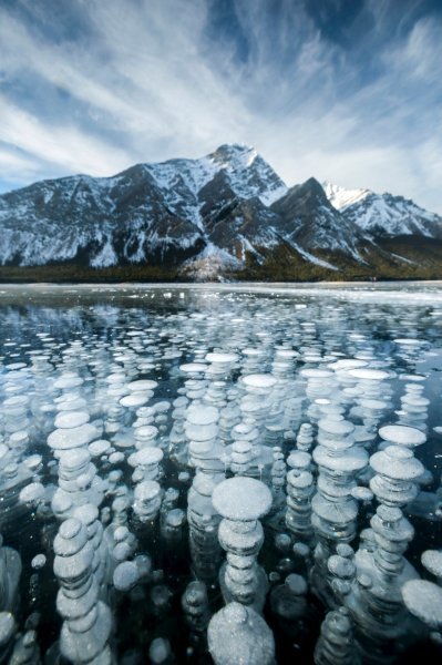 Bijele kugle u jezeru Minnewanka nalaze se u Nacionalnom parku Banff u Kanadi. Bakterije ispuštaju mjehure plinova koji se po putu do površine jezera zalede i stvaraju zanimljive oblike.