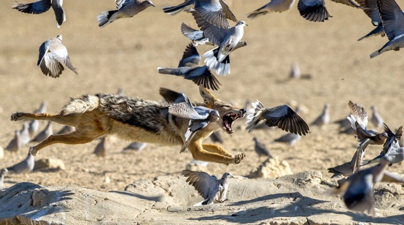 Gladni šakal na fotografiji našao se u grupi ptica, no bio je toliko nespretan da nije uspio baš ništa uloviti. Johan Barnard slikao je fotografije šakala u Parku Kgalagadi.