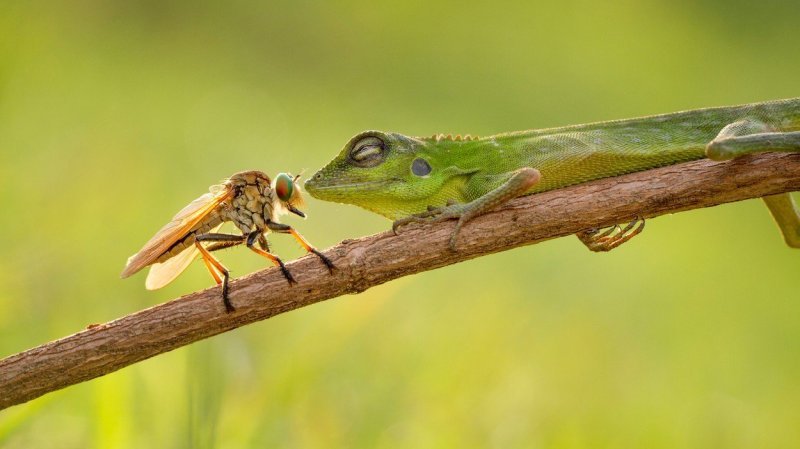 Muha sa smislom za humor gnjavi nezainteresiranog guštera. Fotograf je Hendy Mp iz Sambasa na Indoneziji.