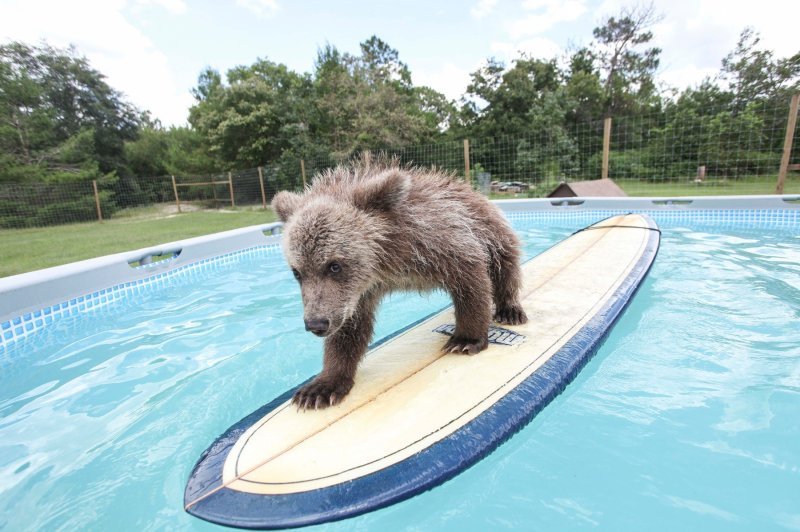 Medvjedić Bruiser živi u Floridi i uz pomoć daske za surfanje se privikava na vodu.