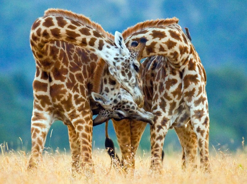 Žirafe plešu i elegantno koriste svoje duge vratove na afričkoj ravnici.