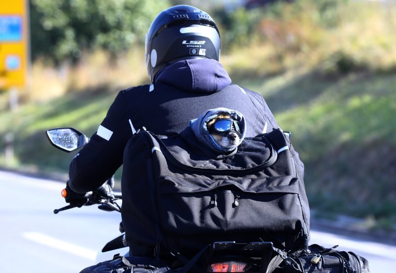 Pas motorist, odjećom i naočalama zaštićen od vjetra, sa svojim vlasnikom iz Francuske uživa u vožnji Splitom