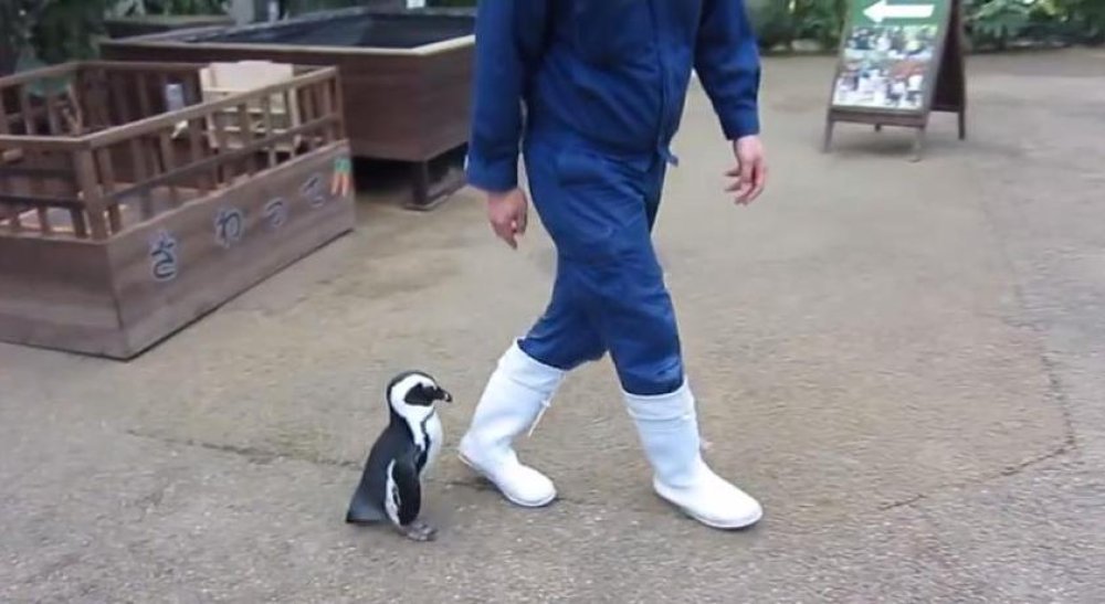 Simpatični pingvin očito misli da postoji neka veza između njega i bijelih čizama. Prilično je usredotočen na obuću koja je na nogama Japanca i prati je gdje god se pomakne. Teško je reći što je posrijedi, no bez obzira na stvarno objašnjenje pingvinove fascinacije bijelim čizmama, apsolutno je neodoljiv!