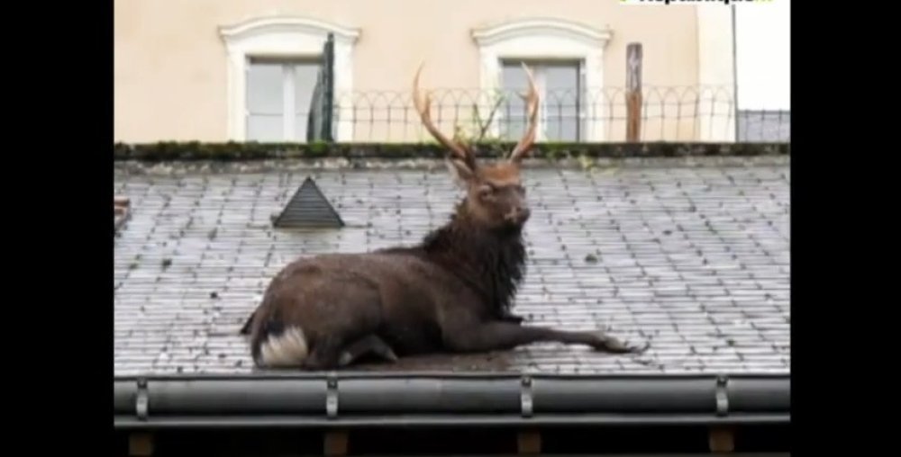 Jelen je zapeo na krovu garaže u gradiću Verneuil-sur-Indre u Francuskoj. Pretpostavlja se da je na krov doskočio iz susjednog vrta, no skliski crepovi su ga zatim obeshrabrili kad je trebao nastaviti svoju šetnju.