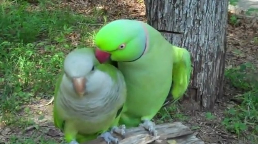 Na simpatičnoj snimci su dvije papige – desno je mala aleksandra (Psittacula krameri), a lijevo je opatica (Myiopsitta monachus).