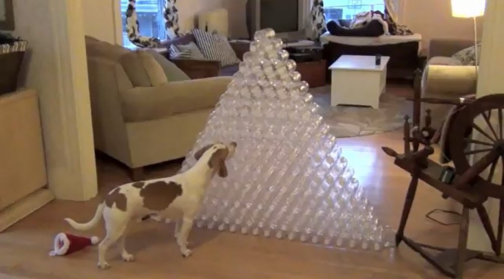 Vlasnik mu je boce složio u veliku piramidu. Bigl je prvo s nepovjerenjem gledao, a kad je shvatio što je dobio i što sve može s njima, njegovoj sreći nije bilo kraja! Pogledajte!