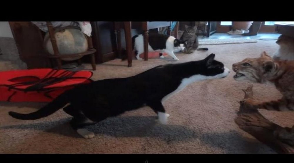 Mačke su vrlo oprezna stvorenja. Razlog tomu je to što su usamljene grabežljivice i u prirodi nemaju prijatelja osim vlastite opreznosti. Njihova reakcija na prepariranog risa zato je vrlo zabavna