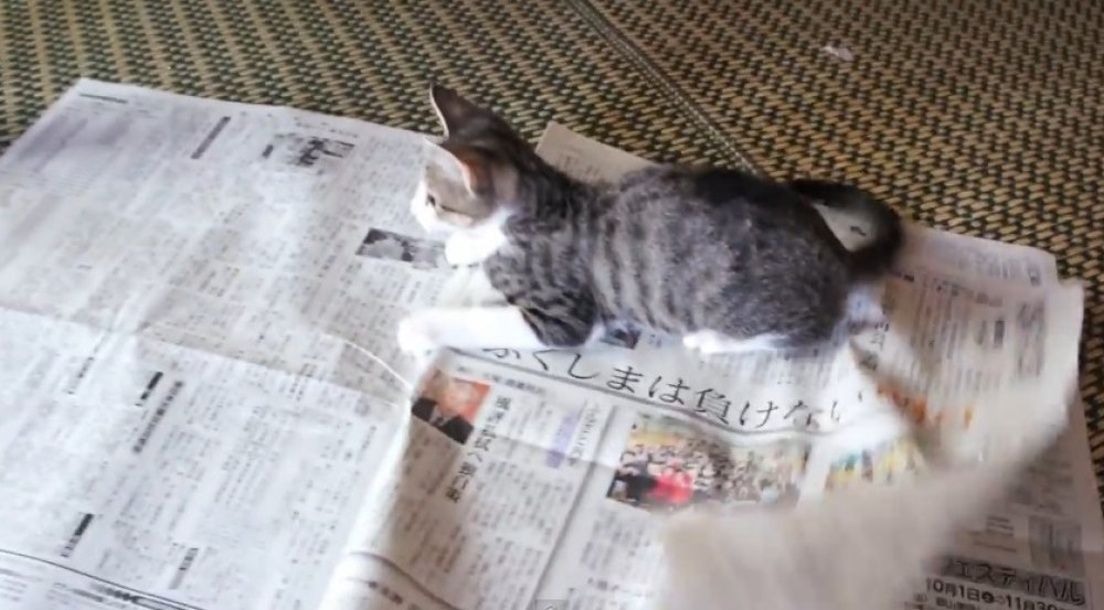 Mačić na snimci očito još ne zna čitati – novine mu služe jedino kao izvor neprekidne zabave