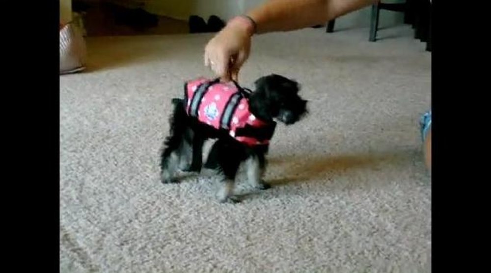 Mala šnaucerica očito se još nije navikla na novi prsluk za spašavanje jer ne može održati ravnotežu u njemu, pa cijelo vrijeme pada. Preslatki psić posebno se potrudio ostati na nogama kad ga je vlasnica ponudila omiljenim keksima.
