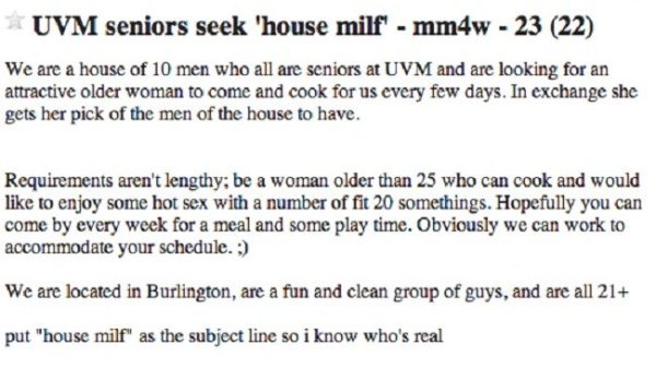 'Ima nas deset u kući, apsolventi smo na UVM-u i tražimo privlačnu stariju ženu koja bi nam povremeno kuhala. U zamjenu kuharica može birati kojeg muškarca u kući želi. Nemamo velike prohtjeve - žena mora biti starija od 25, znati kuhati i mora biti željna vrućeg seksa s dvadeset-i-nešto-godišnjacima. Nadamo se kuhanju i druženju jednom tjedno', napisali su u oglasu.