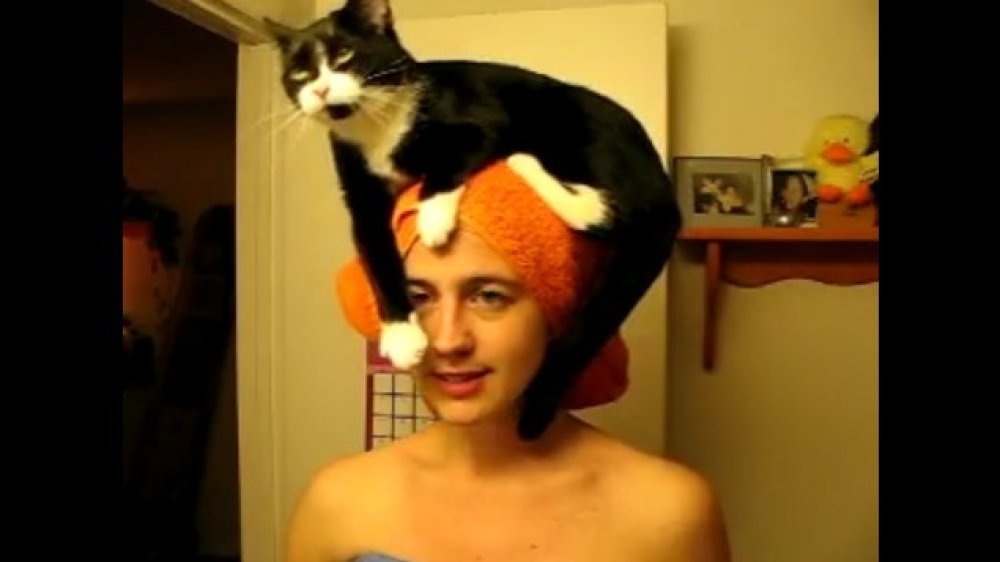 Vlasnica mačke i korisnica YouTubea koja se nazvala Sweetpea377 snimila je zabavan kratki film kako bi dokumentirala što joj se sad već redovno događa poslije tuširanja. Naime, nakon što omota ručnik oko mokre kose i stane pred ogledalo u kupaonici njena mačka skoči joj na glavu i tamo se ugodno smjesti.