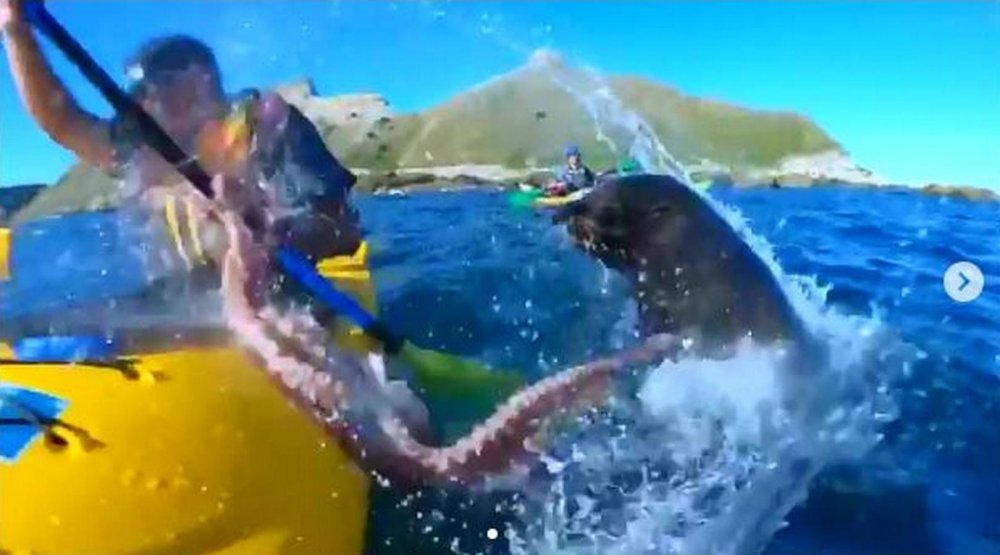 Grupa prijatelja bila je u kajacima u blizini Kaikoure u Novom Zelandu kad su naišli na grupu tuljana. Jedan od izletnika našao se između gladnog tuljana i hobotnice.