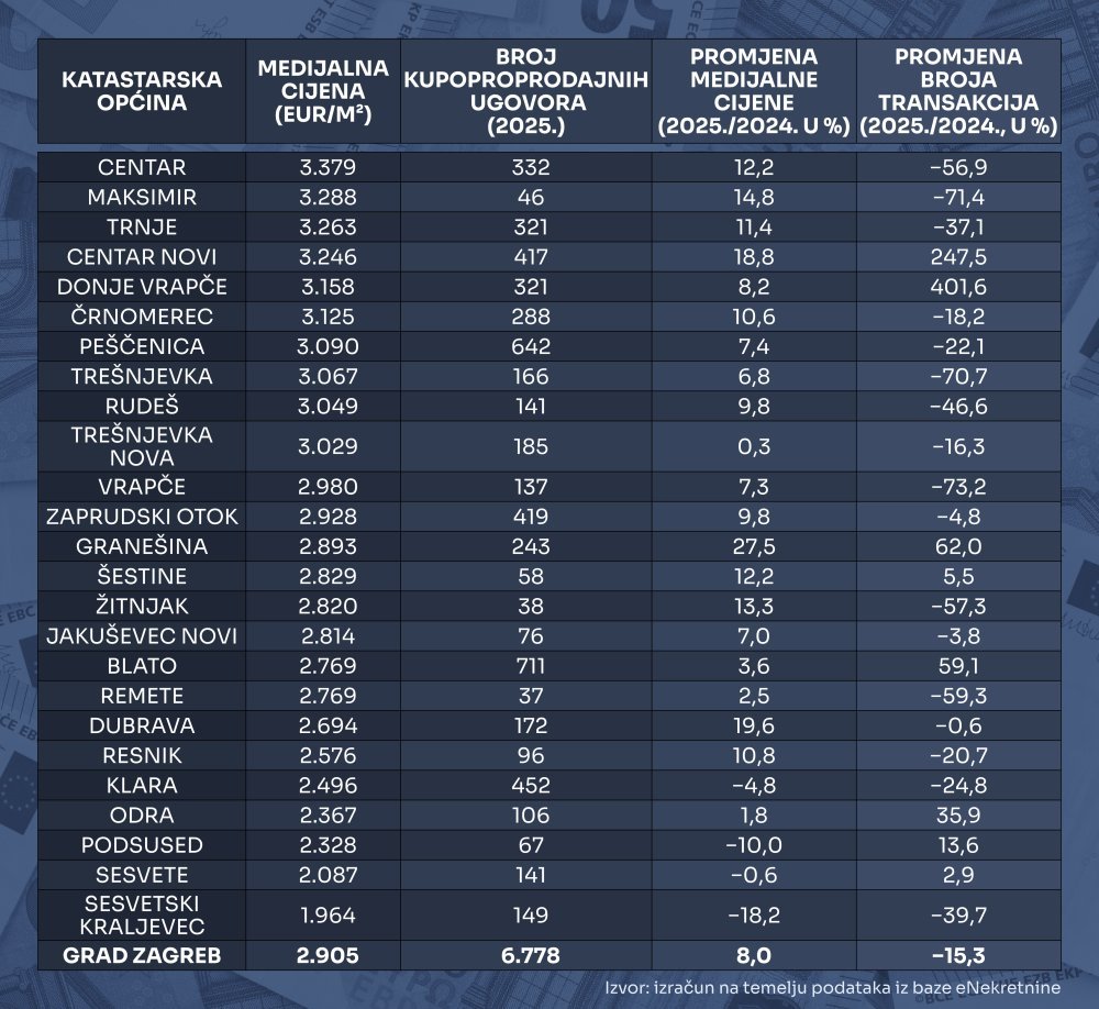 Medijalne cijene stanova u 2025. i pripadne stope rasta u odnosu na 2024. godinu izračunate su na temelju podataka iz baze eNekretnine. Pritom valja imati na umu to da se podaci za 2025. odnose na prvih jedanaest mjeseci, pa još uvijek ne predstavljaju konačne godišnje vrijednosti, dok za 2024. godinu raspolažemo cjelovitim skupom podataka za svih dvanaest mjeseci.