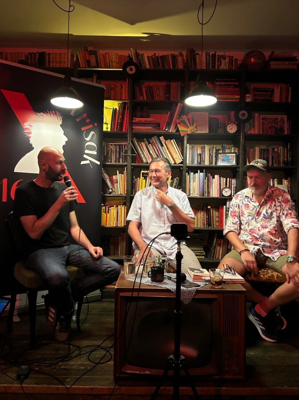 Nakon svršetka promocije 'Potopa' u MMSU, Karakaš potpisuje primjerke romana obožavateljima, a vesela povorka kreće u Book caffe Dnevni boravak, gdje se održava večernji dio programa. Pratimo pisce koji hodaju prebrzo, gubimo se, uključujemo navigaciju i ubrzo se nalazimo ispred kultnog kafića. Atmosfera je ovdje značajno opuštenija, ljudi su uglavnom isti, moderator je ponovno Pogačar. Njemu su u goste stigli Zvonko Karanović i Damir Šodan, koji će odmah nakon ovog dijela programa izvesti koncert s vlastitim prepjevima songova velikog Leonarda Cohena. Među gomilom prepoznajemo Dragu Glamuzinu, umjetničkog voditelja festivala.