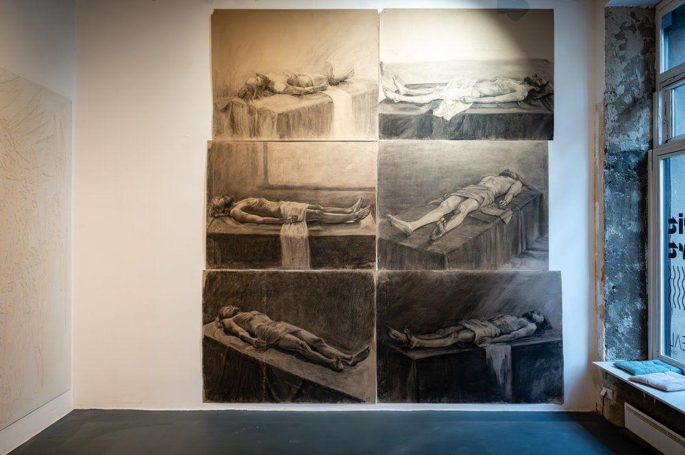 Crteži ugljenom studenata Ante Župića, Marije Žagar, Lorene Perendić, Antonije Šumige, Tonke Lepen i Marije Lene Honstein Tomić studije su Krista, čije je mrtvo tijelo položeno na odar, a oslanjaju se na velike renesansne majstore – Hansa Holbeina mlađeg i njegovo djelo Mrtvi Krist te na ikoničko djelo Andrea Mantegna, Oplakivanje Krista. Izložba u galeriji Spirit of Art, u suradnji s Artisan ginom, i ovoga je puta realizirana uz podršku Real grupe.