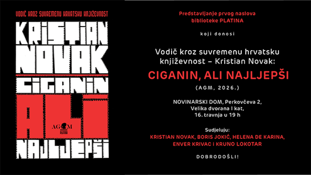 U Velikoj dvorani Novinarskoga doma u Perkovčevoj ulici u Zagrebu u četvrtak, 16. travnja, od 19 sati predstavit će se prvi naslov jedinstvene biblioteke Platina. Riječ je o Vodiču kroz suvremenu hrvatsku književnost: Kristian Novak – Ciganin, ali najljepši (AGM, 2026.), a predstavit će ga Kristian Novak, Boris Jokić, Helena de Karina (suurednica izdanja), Enver Krivac (ilustrator) i Kruno Lokotar (glavni urednik AGM-a).