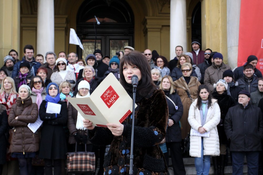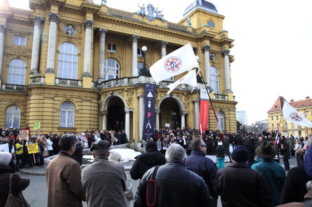 Skup ispred HNK organizirao je Hrvatski sindikat djelatnika u kulturi koji iz prijedloga Ministarstva iščitava drastično smanjenje prava kulturnjaka koji se financiraju iz državnog proračuna. Skup je otvorio nastup članova Opere HNK arijom Zbor židova iz Verdijeve opere 'Nabucco', a među prosvjednicima su većinom bili zaposlenici HNK, Hrvatskog državnog arhiva, Hrvatskog restauratorskog zavoda, Muzeja Mimara te članovi ansambla Lado.