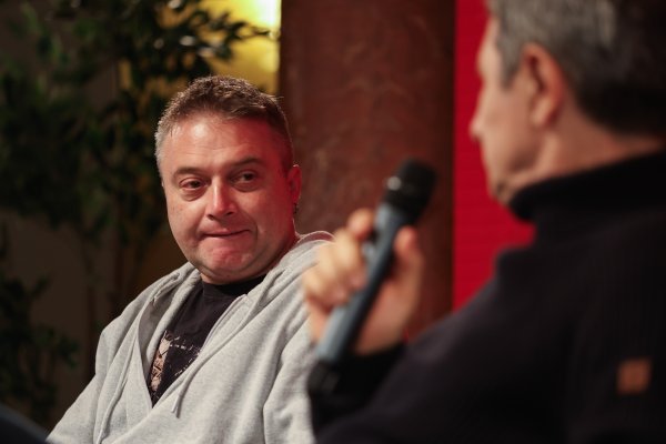 'Dan prije otvorenja, Strašni i Manguel su trebali poletjeti s pariškog Orlyja za Ljubljanu, gdje će ih čekati naš vozač. Oni su na aerodromu u Francuskoj, vozač na putu ka Sloveniji, a nama stiže vijest da zbog nevremena avion neće sletjeti u Ljubljanu već u Veneciju. Naravno da je veliki intelektualac i pisac, autor knjige 'Noć u biblioteci', Alberto Manguel, te godine bio počasni autor Sajma i trebao ga je sljedećeg dana u podne otvoriti. Kako se nije koristio mobitelom, nismo mu mogli javiti za promjenu, pa sam nazvala Strašnog kojeg tada nisam poznavala, opisala mu kako Manguel izgleda i zamolila da ga pronađe na Orlyju. Bio je to krik očajnice: Strašni mi je zvučao izgubljeno i rastreseno, a ja sam od njega tražila nešto potpuno suludo, s obzirom na to kakva gužva vlada na Orlyju. U jednom trenutku sam se pomirila s tim da Manguel neće otvarati Sajam i smišljala tko će ga zamijeniti, a onda se javio naš vozač sa spasonosnom rečenicom: 'Obojica su u autu!'. Čekali smo, Manguela, a još više našeg heroja Strašnog. Očekivala sam nekog ogromnog, namrgođenog, odlučnog čovjeka, ali, pokazalo se, Strašni nije uopće strašan, krhko je biće i likom i dušom, jedan je od najnježnijih ljudi koje sam upoznala. Na pitanje kako je pronašao Manguela među tolikim ljudima na Orlyju, on je, s onim svojim umiljatim poluosmijehom, odgovorio kao da je imao najlakši zadatak na svijetu: 'Pogledaj ga, njega ne možeš promašiti'', kaže Vodopija.