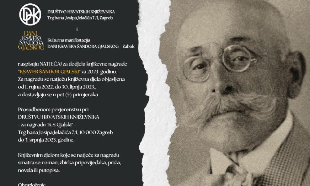 Kulturna manifestacija Dani Ksavera Šandora Gjalskog - Zabok i Društvo hrvatskih književnika raspisuju natječaj za dodjelu književne nagrade 'Ksaver Šandor Gjalski' za 2023. godinu.