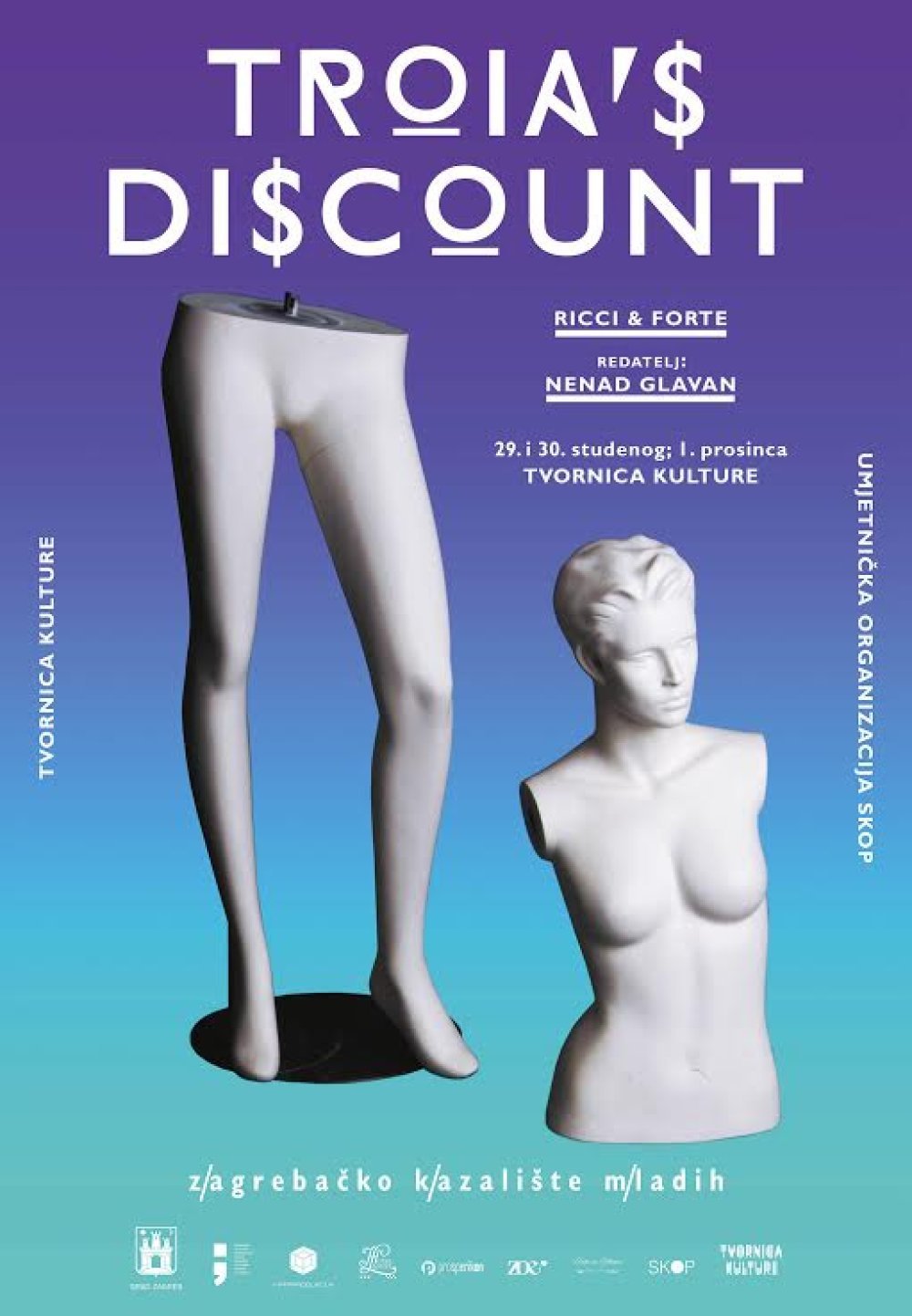 U koprodukciji Zagrebačkog kazališta mladih, Tvornice kulture Zagreb i Umjetničke organizacije SKOP premijerno će u subotu 29. studenoga biti izvedena predstava 'Troia's Discount' redatelja i autora scenske instalacije Nenada Glavana, najavili su iz ZKM-a.