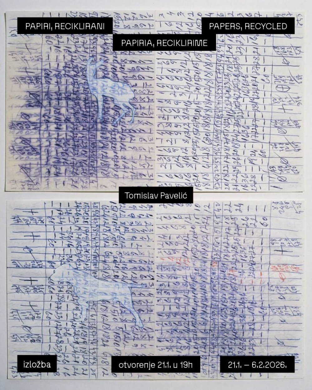 Izložba Papiri, reciklirani Tomislava Pavelića, koja se otvara u srijedu 21. siječnja u Galeriji Događanja Centra kulture na Peščenici, donosi radove nastale na već korištenom papiru, u kojima se bilješke, zapisi i fragmenti svakodnevice pretvaraju u umjetnički materijal.
