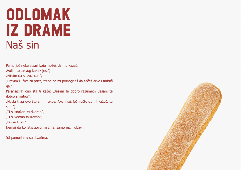 Njegov autorski projekt "Naš sin" intimna je, iskrena, poetična, duhovita i na trenutke tragična priča o roditeljima koji duboko u sebi ne nalaze način da prihvate identitet svog gej sina i koji, iako misle da su pokušali sve, ipak ostaju zatočenici uvjetovane ljubavi, na koju su jedino spremni.