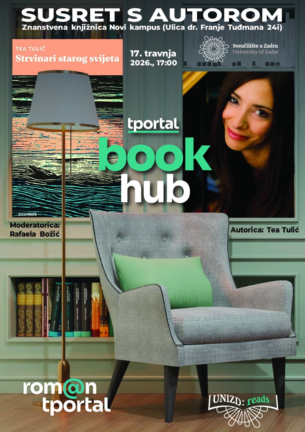 Tportalova književna platforma BookHub nastavlja širiti mrežu susreta između suvremene hrvatske književnosti i novih generacija čitatelja: nakon uspješnih gostovanja dobitnika tportalove književne nagrade Olje Knežević i Želimira Periša u Zagrebu i Splitu, sljedeća postaja je Zadar, gdje će se u petak, 17. travnja, u prostoru Znanstvene knjižnice na Novom kampusu Sveučilišta u Zadru održati književni susret s Teom Tulić.