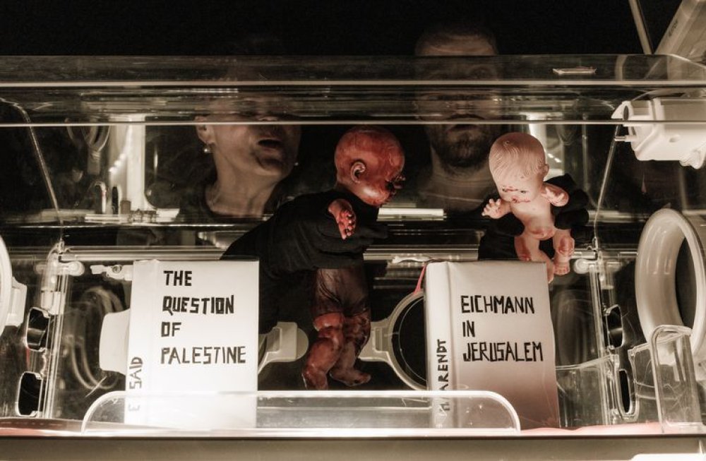 Upravo se ta simbolika u predstavi povezuje s brutalnom sadašnjošću rata u Gazi, osobito s prizorima inkubatora bez električne energije u bolnici Al Shifa te novorođenčadi stisnute zajedno kako bi se međusobno ugrijala. Ti prizori postaju snažno scensko pitanje o granici između zaštite života i njegova sustavnog poništavanja.