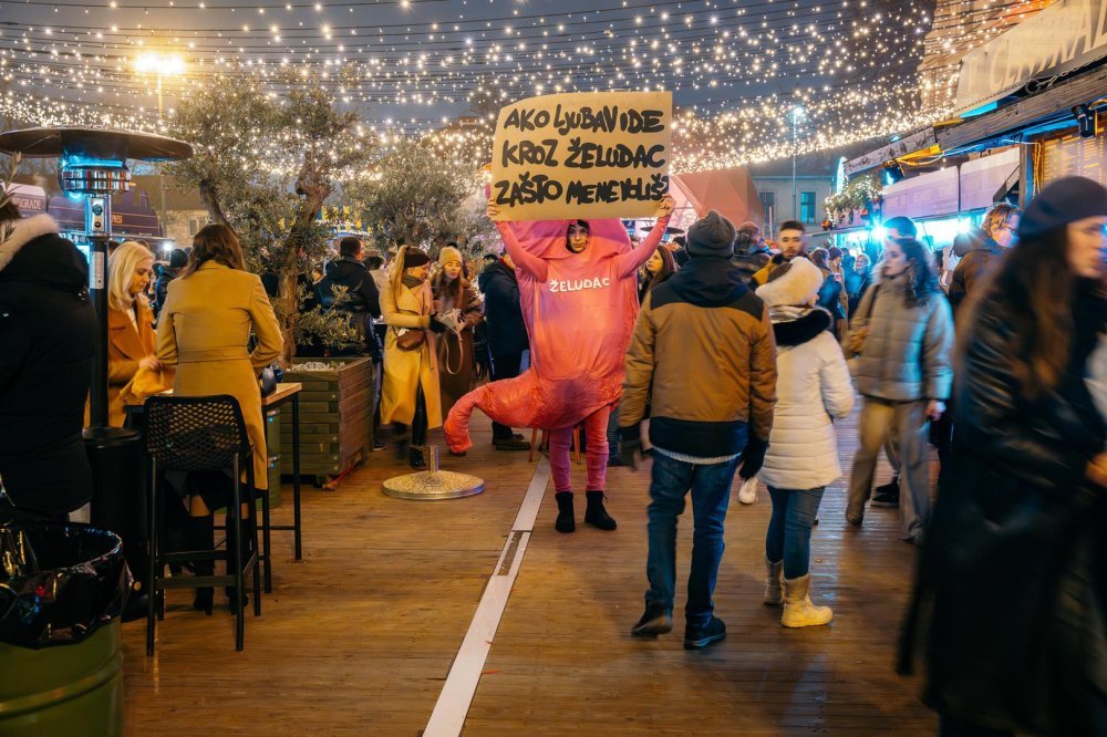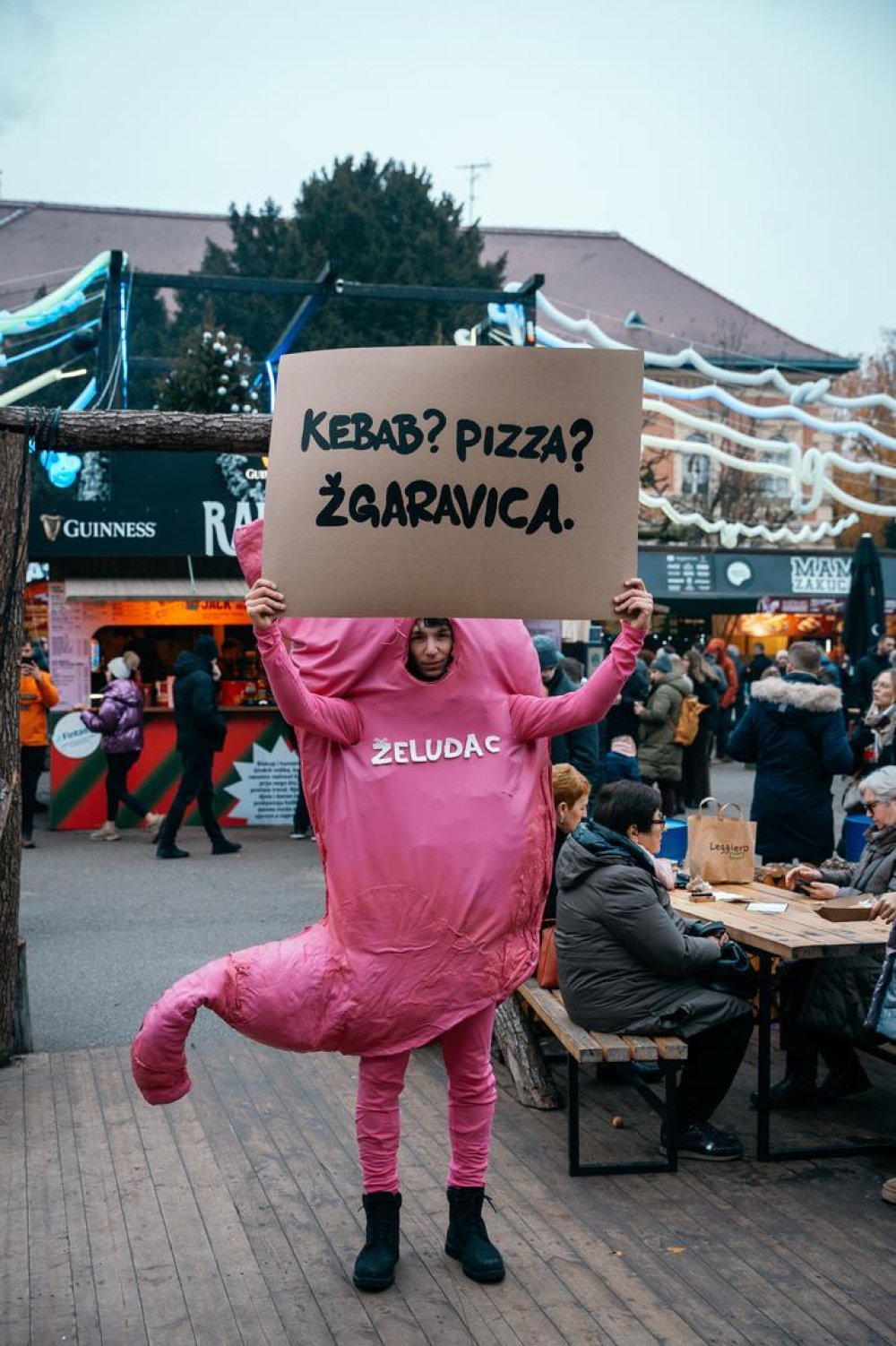Upravo zato, na zagrebačkom adventu pojavio se Žele, simpatičan lik koji predstavlja naš vlastiti želudac. Bez riječi, ali s jasnim porukama na transparentima, Žele je stajao među posjetiteljima na lokacijama Fooling Around na Oleander terasi Esplanade Zagreb hotela i Fuliranje na Strossmayerovom trgu. Njegova prisutnost prirodno se uklopila u adventsku gužvu, a prolaznici su znatiželjno promatrali i komentirali koliko su poruke „pogodile u srž“.