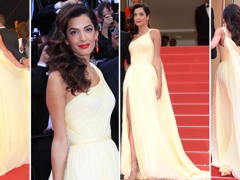 Ljubiteljica dizajnerskih krpica nosila je blijedožutu haljinu Ateliera Versace koja joj je lepršavošću i dodatnim plaštom radila probleme tijekom poziranja, ali držeći se čvrsto za ruku supruga, Amal je sa smiješkom savladala nekoliko neugodnih trenutaka i usput pokazala duge vitke noge.