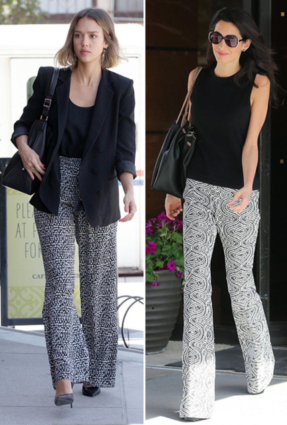 Jessica Alba za poslovni sastanak s redateljem Jamesom Cameronom odjenula je hlače s printom ravna kroja te dodala crni top, sako i štikle. Amal je pak viđena u New Yorku u sličnim hlačama, također s monokromnim uzorkom, ali trapez kroja. Uz taj uzorak i kroj isfurala je jedan od najvećih trendova ove godine, odnosno retro look koji podsjeća na 70-e godine prošlog stoljeća. Supruga slavnog Georgea Clooneyja uz hlače je uparila klasičnu crnu majicu i nezaobilazne štikle.
