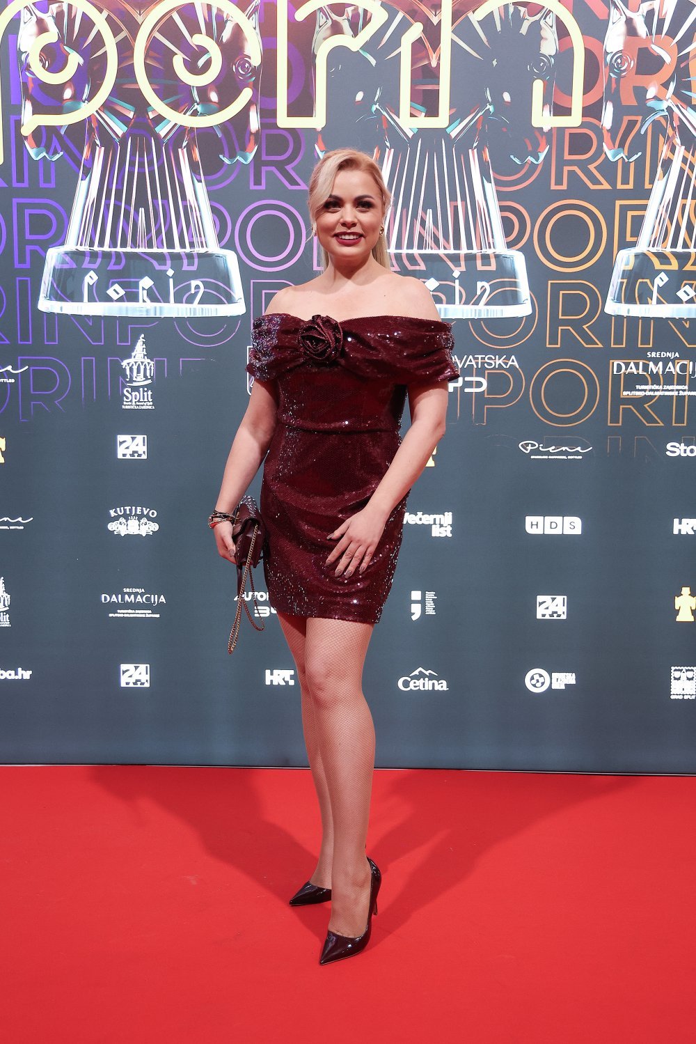 Andrea Šušnjara je za crveni tepih Porina odjenula mini haljinu od tamnocrvenog, visokosjajnog materijala posutog sitnim šljokicama, koja prati liniju tijela i završava iznad koljena.