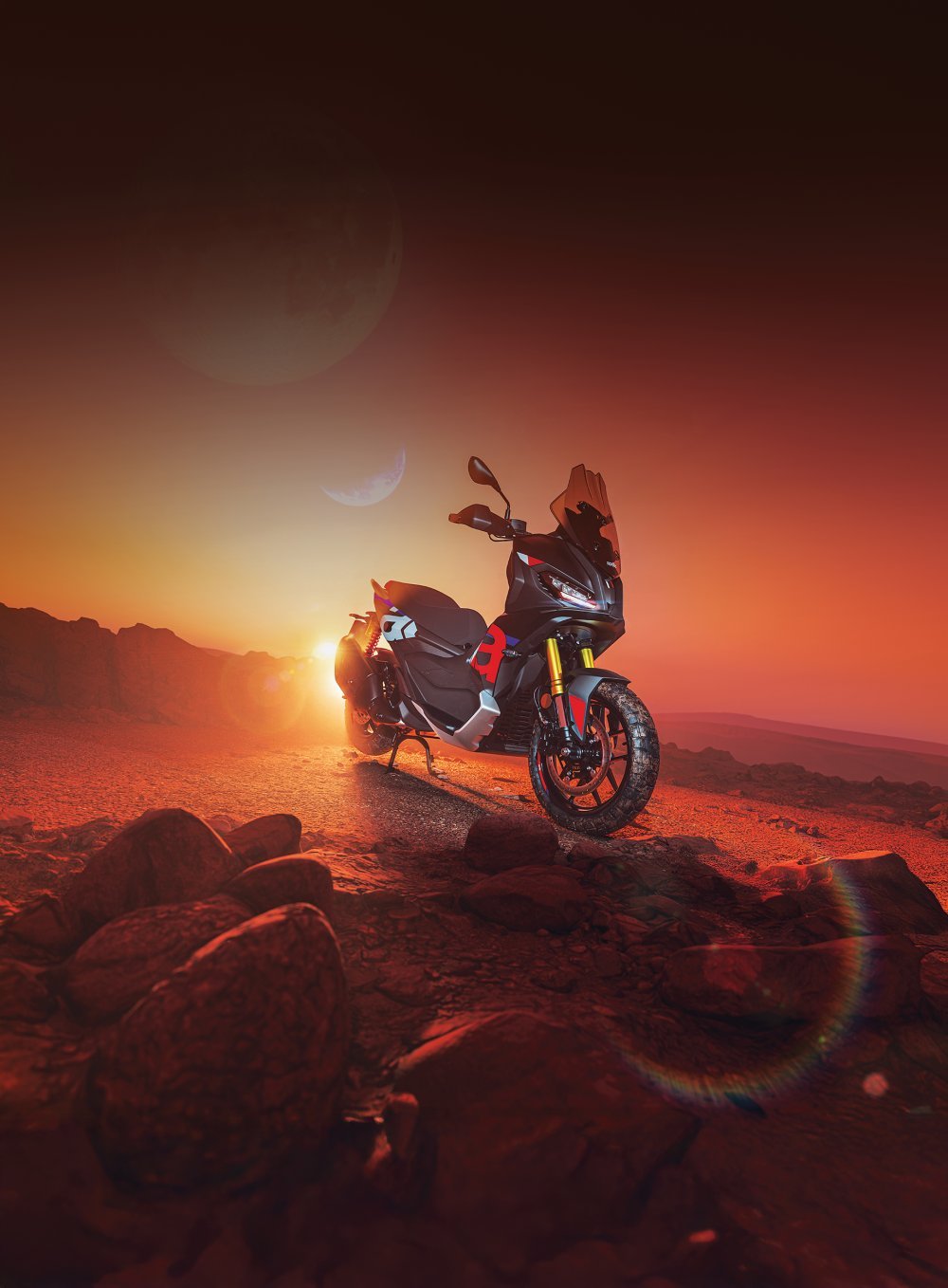 Rezultat je zapanjujući skuter snažne osobnosti koji izražava pravu dinamičnost, zahvaljujući svom dotjeranom, oštrom oklopu koji podsjeća na enduro motocikle, gdje je svaki detalj bez određene funkcije eliminiran.