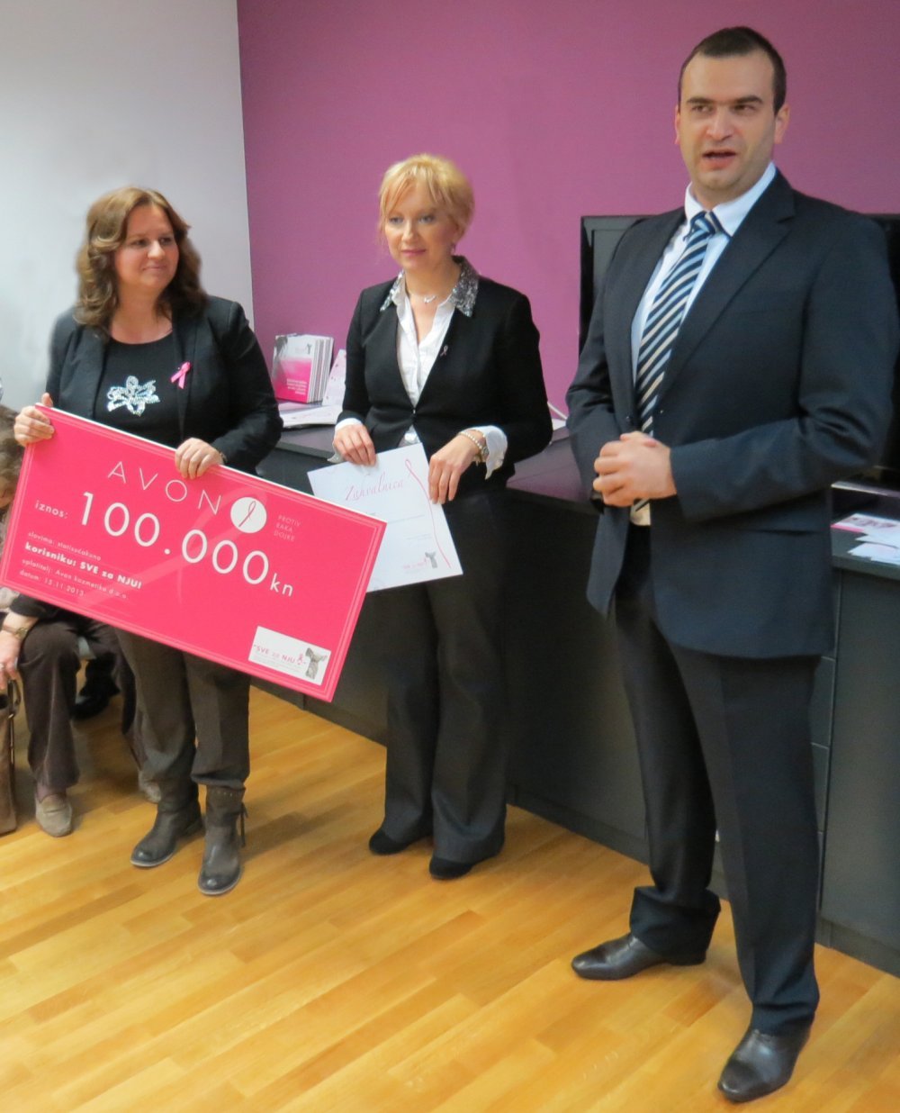 'Avon je i ovog listopada bio ponosan partner Udruge. Kampanja 'Povedi i nju, svoju prijateljicu' koja je ovog listopada, 'roza' mjeseca posvećenog borbi protiv raka dojke, pozvala sve žene da misle na svoje zdravlje i na taj način podizala svijest o ovoj bolesti. U Udruzi SVE za NJU! smo, kao kompanija za žene, pronašli pravog partnera - njihov je rad profesionalan i potreban. Zahvalni smo radu Udruge jer znamo da je naša donacija otišla na pravo mjesto', rekla je Lucija Josipović, Voditeljica odnosa s javnošću i oglašavanja u Avonu