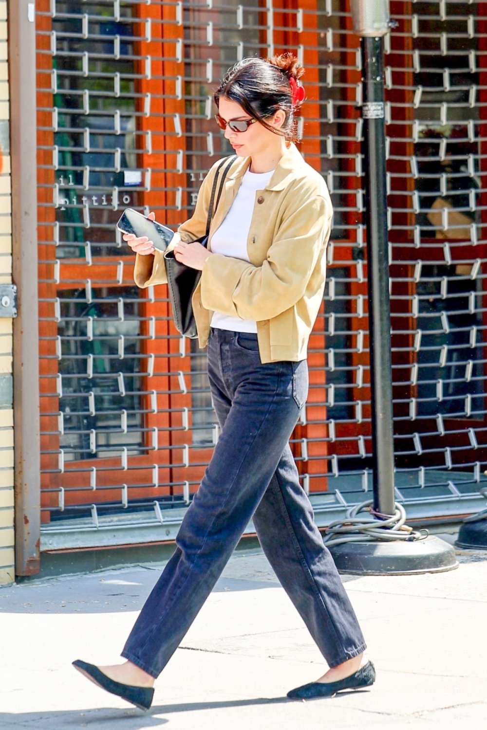 Balerinke s blago špičastim, bademastim vrhom savršeno utjelovljuju jednostavnu eleganciju, što potvrđuje i Kendall Jenner. Njihov minimalistički oblik lako se uklapa ispod traperica ravnog kroja i stvara čistu, izduženu liniju. Kontrast između čvrstoće trapera i mekoće kožne balerinke rezultira skladnom i profinjenom kombinacijom. Ovaj stajling ne traži pozornost, ali je uvijek dobiva zahvaljujući svojoj jednostavnoj sofisticiranosti. Idealno pristaje uz košulju, klasični sako i druge komade koji elegantno balansiraju između casual i formalnog stila.