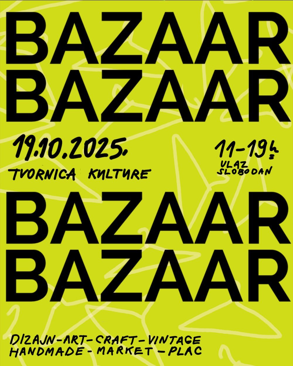 Za povratak na scenu Bazaar je odabrao našu najveću koncertu dvoranu, Tvornicu kulture u Šubićevoj. U nedjelju 19. listopada predstavit će oko 50-tak izlagača s dizajnerskom odjećom I modnim dodacima, vintage odjećom, namještajem, prirodnom kozmetikom, stripovima, ilustracijama, nakitom i mnogim drugim proizvodima. Vrata Bazaara otvorit će se u 11:00, a zatvoriti u 19:00.
