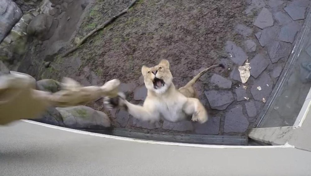 Čuvarica Beth Foster radi u Oregonskom zoološkom vrtu gdje, između ostalog, tamošnjim afričkim lavovima pruža prijeko potrebnu zabavu. Beth s krova zgrade izaziva lavove s ogromnom platnenom igračkom.