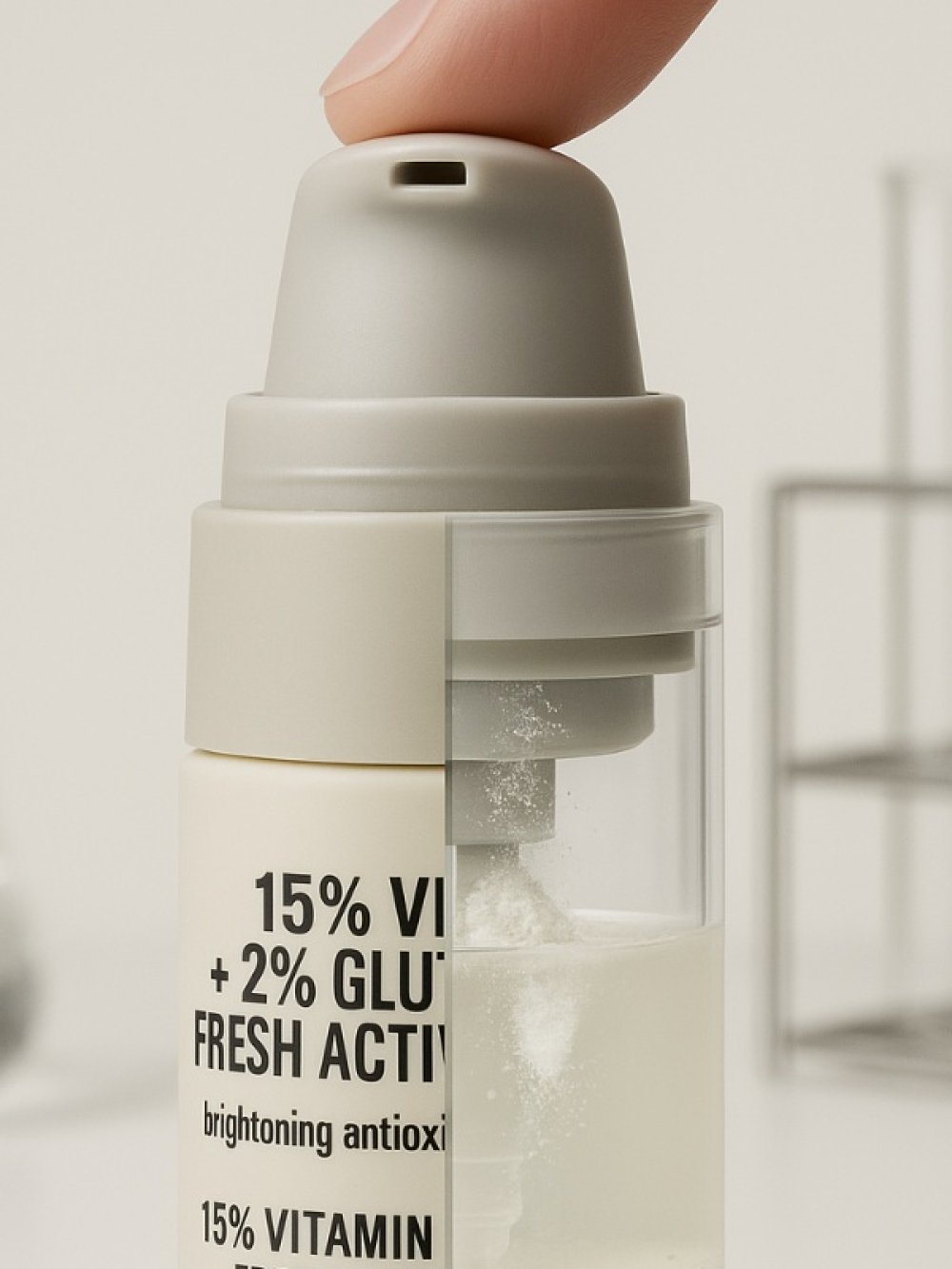 Inovacija koju morate isprobati je 15% Vitamin C + 2% Glutathione Fresh Active Serum koji dolazi u fresh-mix pakiranju. Vitamin C aktivira se tek pri otvaranju, čime se postiže maksimalna učinkovitost. U kombinaciji s glutationom pruža: